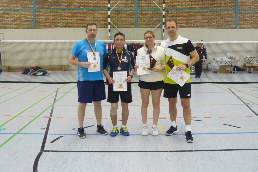 Am 14.2. reisten vier unserer Vereinsmitglieder nach Zerbst zum 4. Golden Age Turnier. Das Besondere an diesem Doppelturnier ist, dass die Summe der Lebensjahre der Doppelpartner ausschlaggebend für die Altersklasseneinteilung ist. So starteten Nico und Truong in der Altersklasse O 100, sowie Kirstin und Dennis in der O 90. Ungewöhnlich ist auch, dass Herrendoppel, Damendoppel und Gemischte Doppel gegeneinander antreten. Gespielt wurde innerhalb der Altersklassen im Jeder-gegen-jeden Modus. Somit hatten beide Rathenower Doppel fünf Spiele zu bestreiten. Nach vier Spielen standen für Nico und Truong zwei klare Siege aber auch zwei Niederlagen gegen sehr starke Gegner zu Buche. Nun musste ihr letztes Spiel, welches auch das letzte Spiel des gesamten Turniers war, entscheiden, ob sie einen Platz auf dem Treppchen erreichen würden. Mit einem klaren Zweisatzsieg sicherten sie sich Platz 3 und wurden dafür mit einer Urkunde und einer Medaille belohnt. Kirstin und Dennis waren nach vier Spielen immer noch ungeschlagen und trafen im letzten Spiel auf ein Mix aus Karstädt/Havelberg. Nach vielen sehenswerten Ballwechseln sicherten sie sich auch hier den Sieg. Damit belegten sie Platz 1 in ihrer Altersklasse.